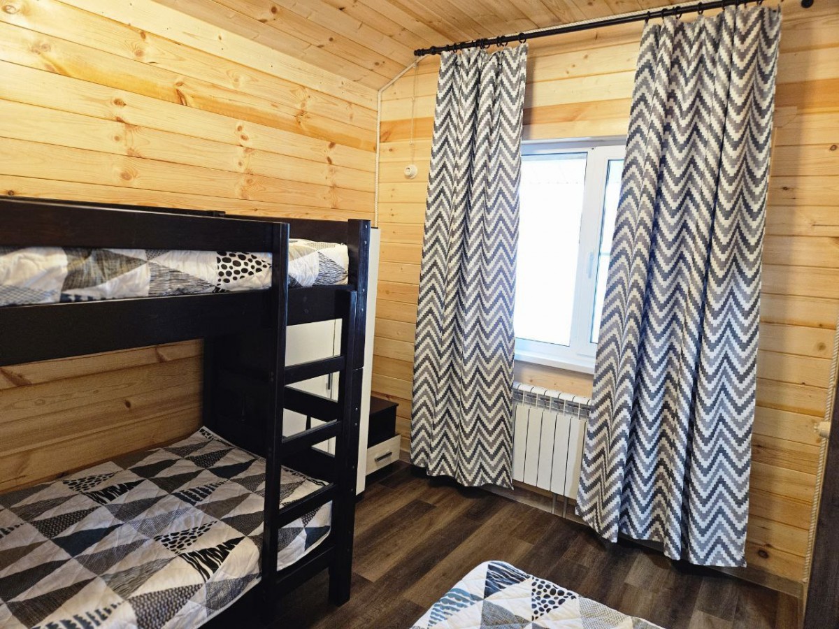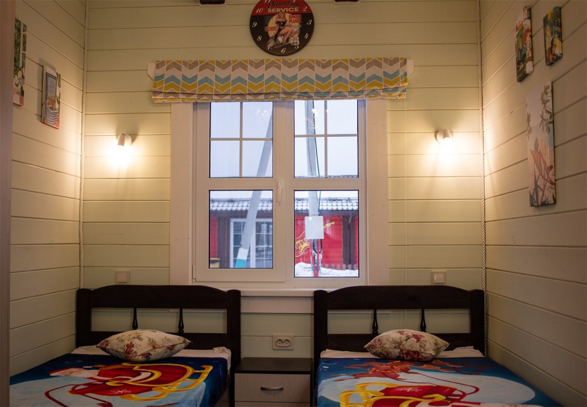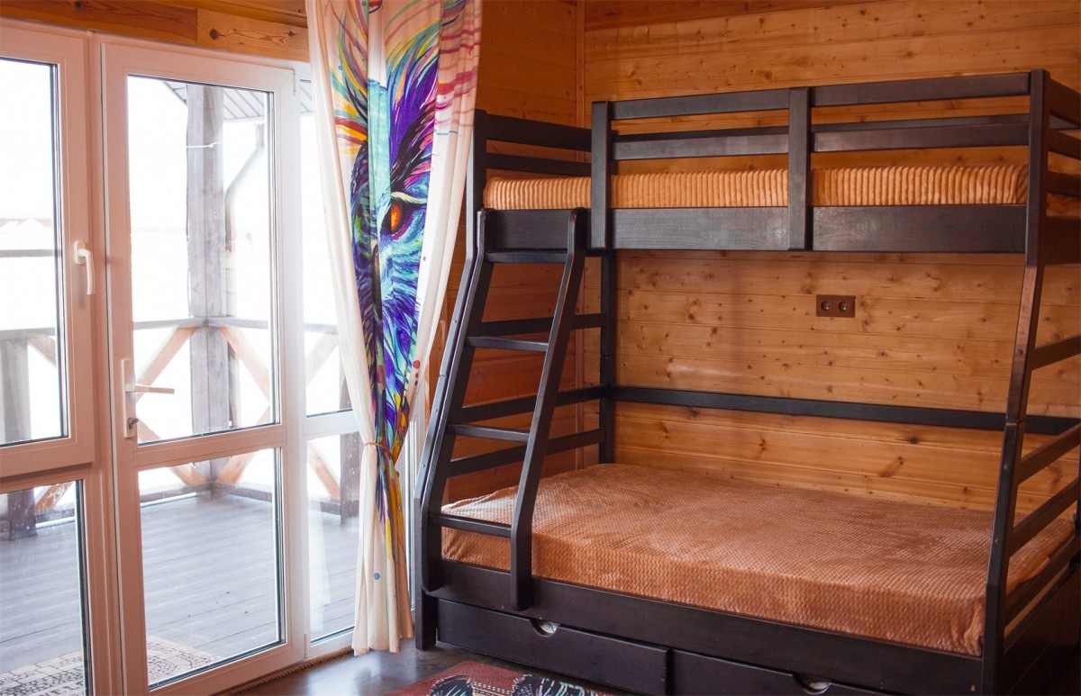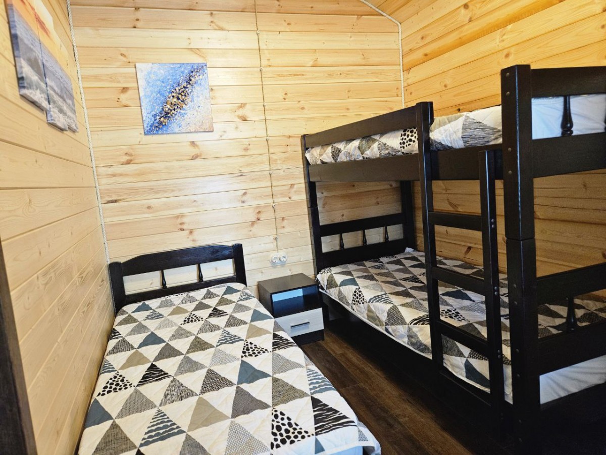 В трех каркасных домах внутреннее пространство разделено на две комнаты: уютную гостиную и детскую комнату с двухъярусной кроватью.