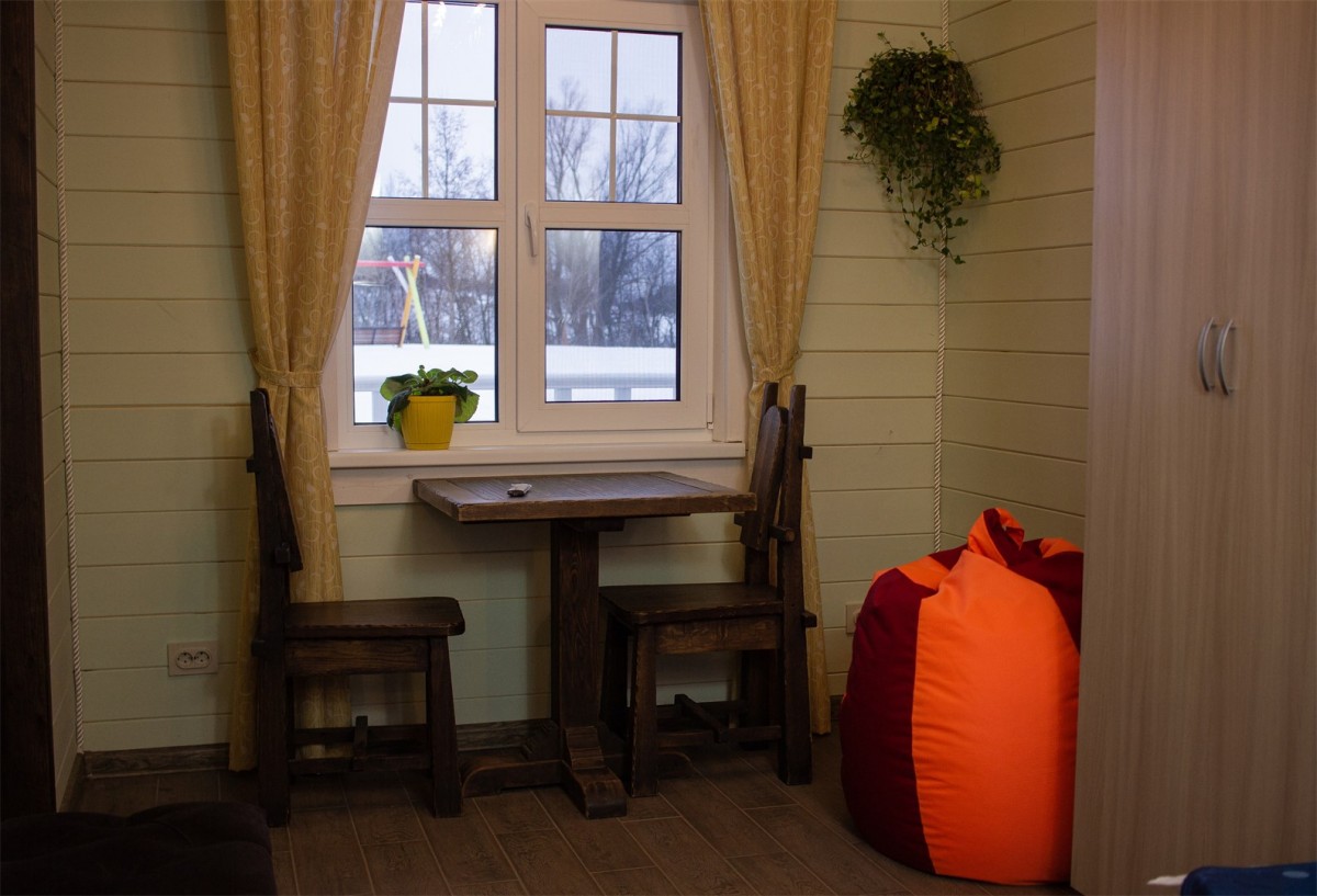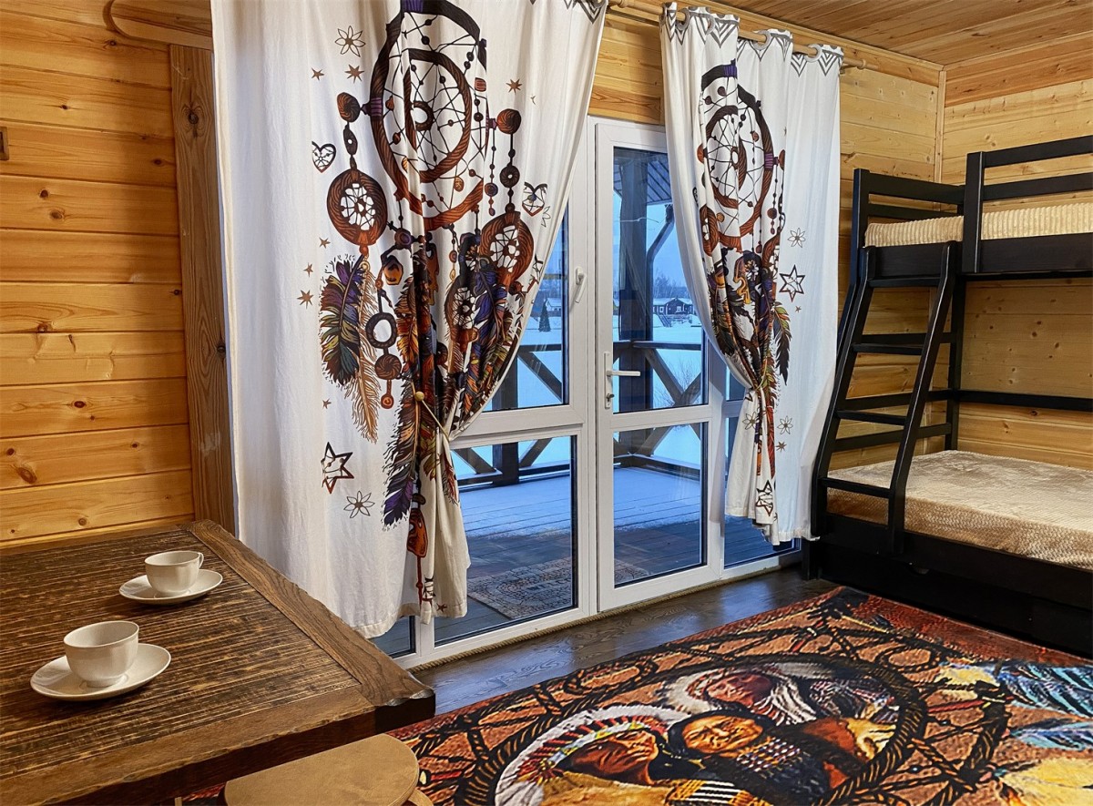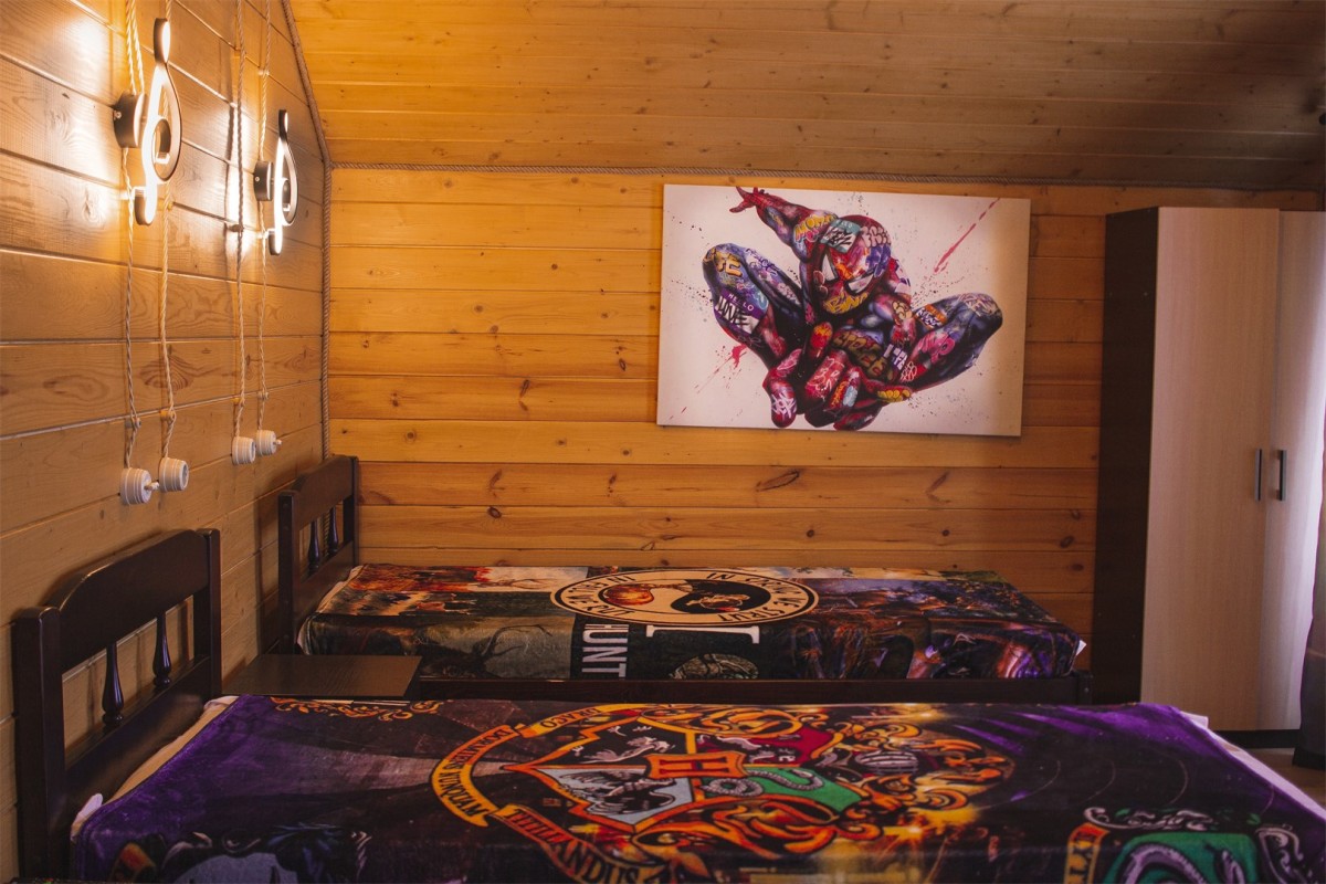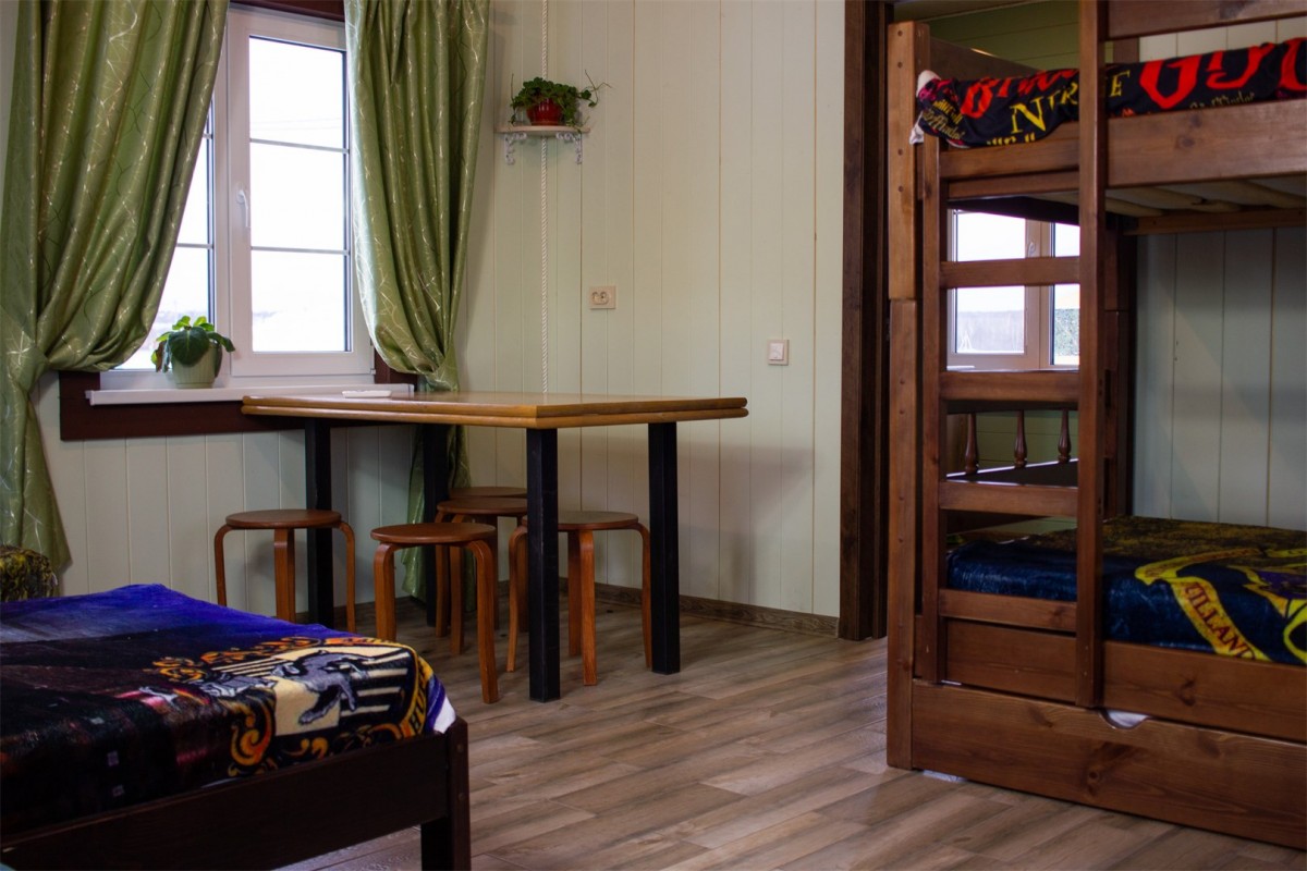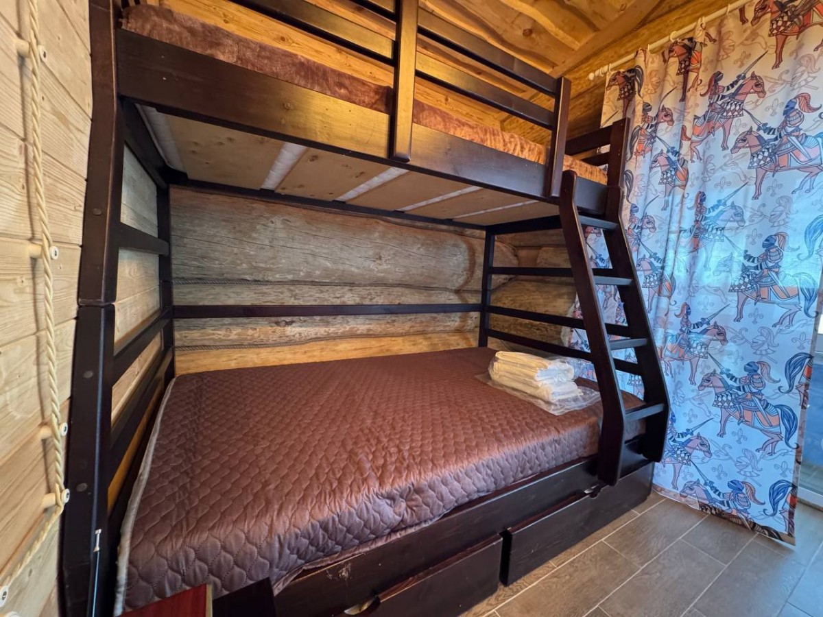В трех каркасных домах внутреннее пространство разделено на две комнаты: уютную гостиную и детскую комнату с двухъярусной кроватью.