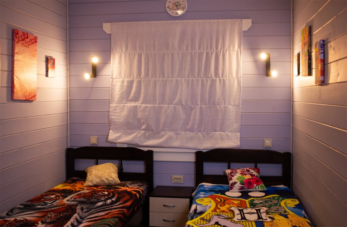 На втором этаже – 2 односпальные кровати. На первом Два двух-спальных дивана.