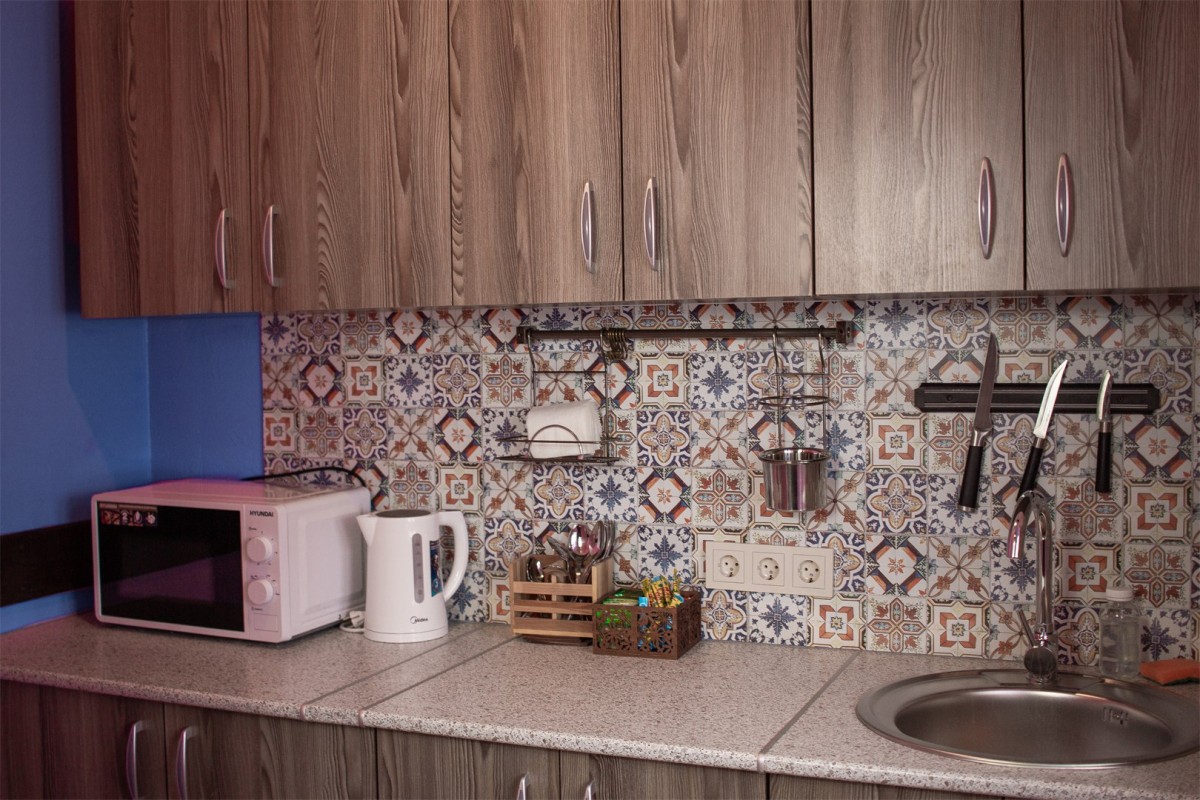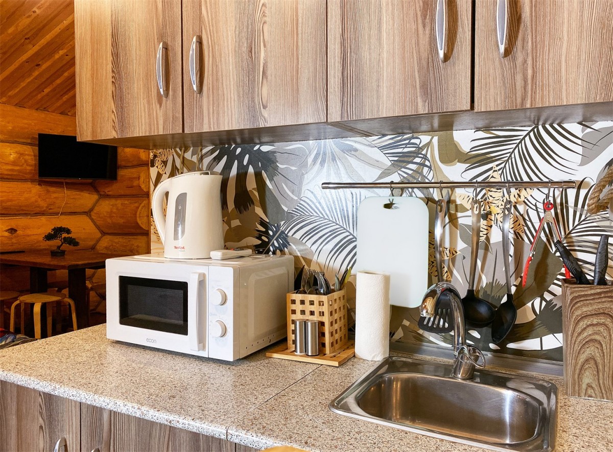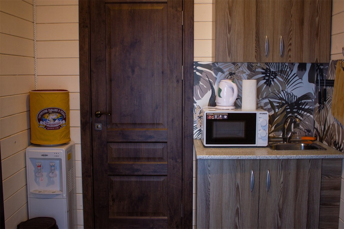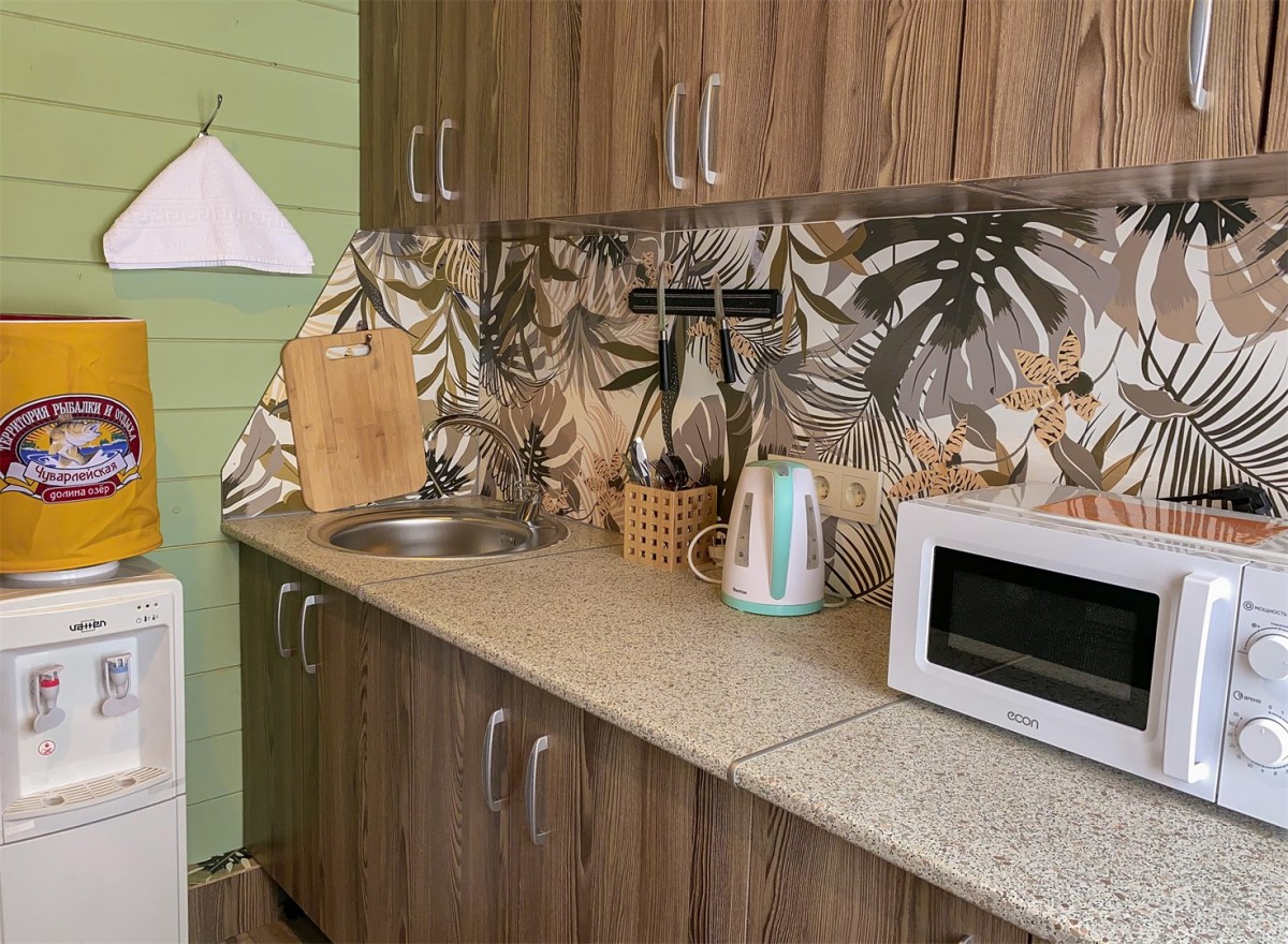 - Мини-кухня (холодильник, СВЧ, кулер, чайник, посуда)